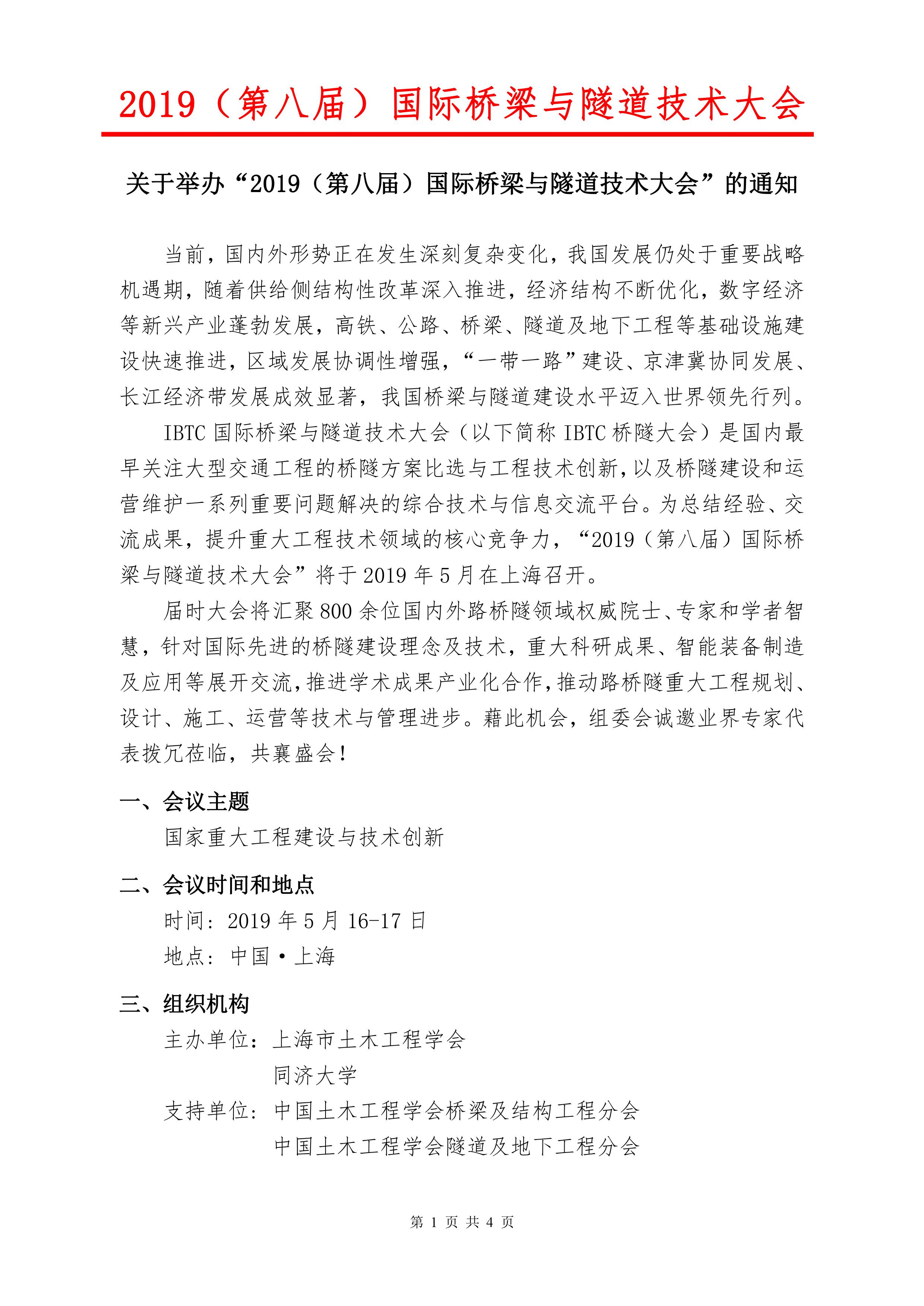 关于举办“2019(第八届)国际桥梁与隧道技术大会”的通知